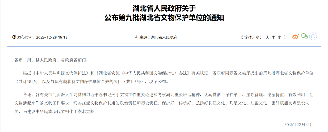近日,省人民政府公布第九批湖北省文物保护单位,我市
